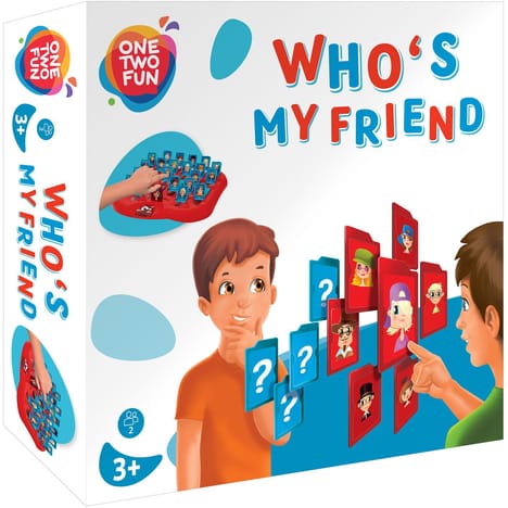 Who's my friend - Made in China - 1gra (2 plansze do gry, czerwona i niebieska, 52 karty z postaciami): karton, plastik, papier, kolor ; w pudełku 32x30x7 cm
