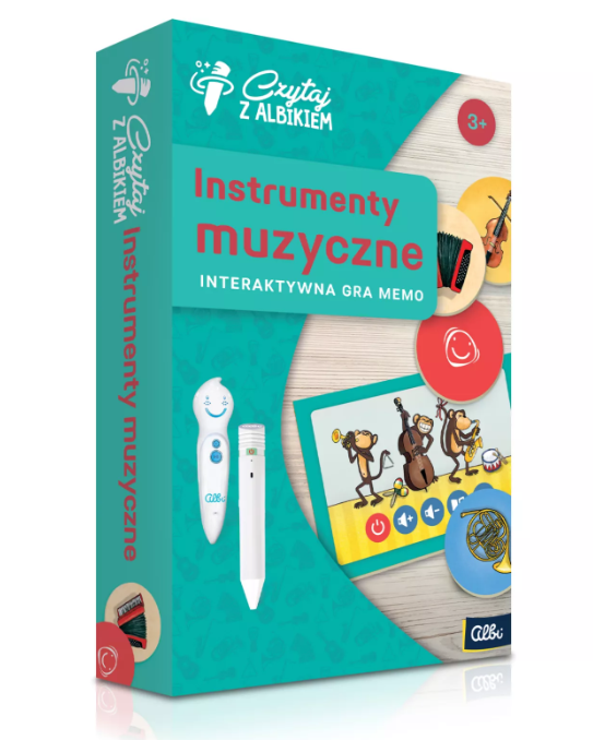 Instrumenty muzyczne : interaktywna gra memo/ [ilustracje Alena Vobedova ; tekst Eva Mala]. - [Kraków : Albi Polska], 2025 - Gra zawiera: 48 żetonów, 2 karty z zasadami, 17,5x10,5 cm.