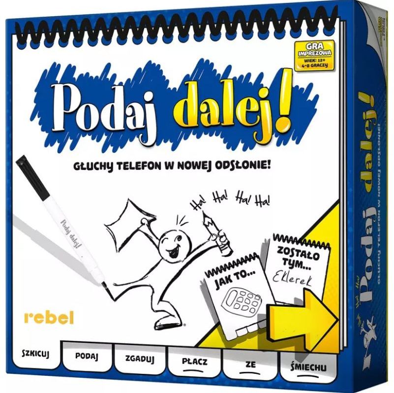 ”Podaj Dalej!” nie jest zwykłą grą imprezową, to świetna zabawa w najczystszej postaci! Każdy z graczy będzie musiał zarówno popisać się fantazją i wyobraźnią, rysując wylosowane hasło, jak i odgadnąć co narysowali inni gracze. Chwyć za szkicownik - rysuj, zgaduj i Podaj Dalej! Podaj dalej! to rysowany głuchy telefon, jeśli pierwszy i ostatni obrazek w szkicowniku się zgadzają to znaczy, że gracze prawidłowo odgadywali hasła. Jeśli nie? No cóż - wtedy na pewno do łez rozbawi was ciąg myślowy i prześmieszne rysunki stworzone przez graczy pod presją czasu. W efekcie waszych starań powstanie w każdym szkicowniku ciąg skojarzeń kolejnych osób. (opis wydawcy).