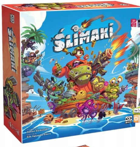 Ślimaki / projekt gry: Damian Stankowski ; ilustracje Djib, Agnieszka Sikora. - Kraków : Galakta, [2024]. - 1 pudełko [Instrukcja, 1 dwustronna plansza, 2 kości ataku, 1 licznik rund / znacznik 1. gracza, 4 arkusze pomocy, 4 planszetki graczy, 6 kafelków frakcji, 41 dwustronnych kafelków terenu, 18 znaczników ślimaków, 16 plastikowych podstawek, 110 kart akcji, 18 żetonów życia, 18 żetonów deklaracji, 3 żetony dynamitu, 8 żetonów ognia, 2 żetony min, 10 żetonów uszkodzenia terenu, 1 znacznik skażenia, 3 znaczniki użycia specjalnej zdolności frakcji, 8 muszli] ; 30x30x7 cm.