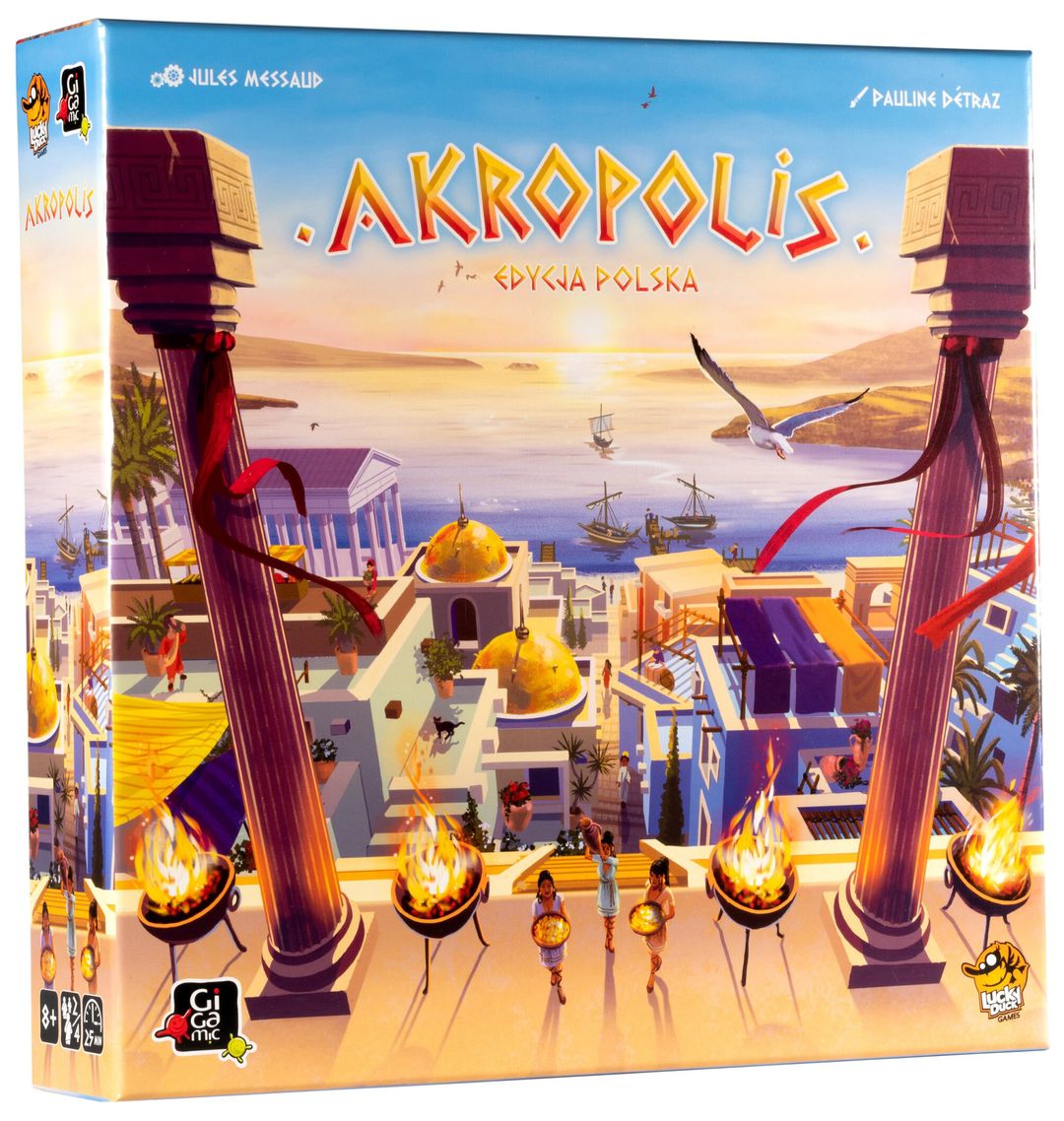 Akropolis : edycja polska / autor: Jules Messalid ; ilustracje: Pauline Détraz ; tłumaczenie i skład: Marek Baranowski. - Kraków : Lucky Duck Games, © 2022. - 1 pudełko (61 kafli miasta, 4 kafle startowe, 4 pomoce gracza, notatnik, znacznik głównego architekta, 40 kostek kamienia, instrukcja) ; 26x26x6 cm.
