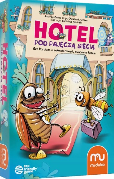 Hotel pod pajęczą siecią : gra karciana o zakwaterowaniu owadów w hotelu / autorzy Dennis Kirps, Christian Kruchten ; ilustracje Gediminas Akelaitis ; [tłumaczenie Sławomir Czuba]. - Podłęże : Muduko, 2025. - 1 gra (4 hotele dla owadów, 20 kart miodu, 8 kart pająków, 8 kart karaluchów, 36 owadzich turystów) : karton, tektura, kolor pudełko ; w pudełku 21x14x4 cm + instrukcja (4 strony : ilustracje ; 20 cm).